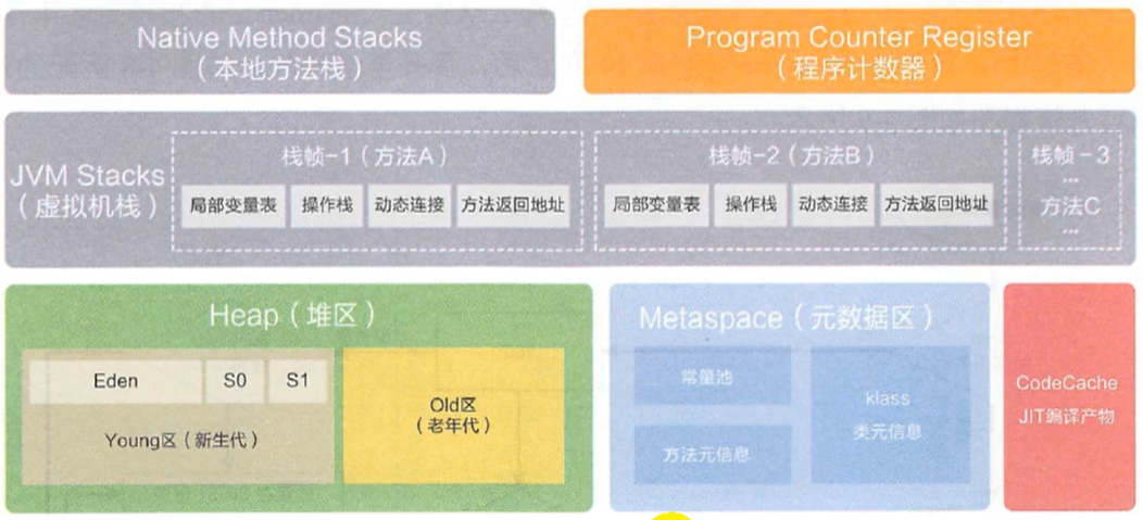 - 线程间共享:堆、堆外内存(永久代或元空间、代码缓存)。