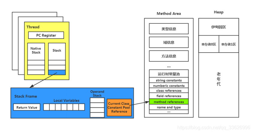 - 动态链接、方法返回地址、附加信息 :有些地方被称为帧数据区;